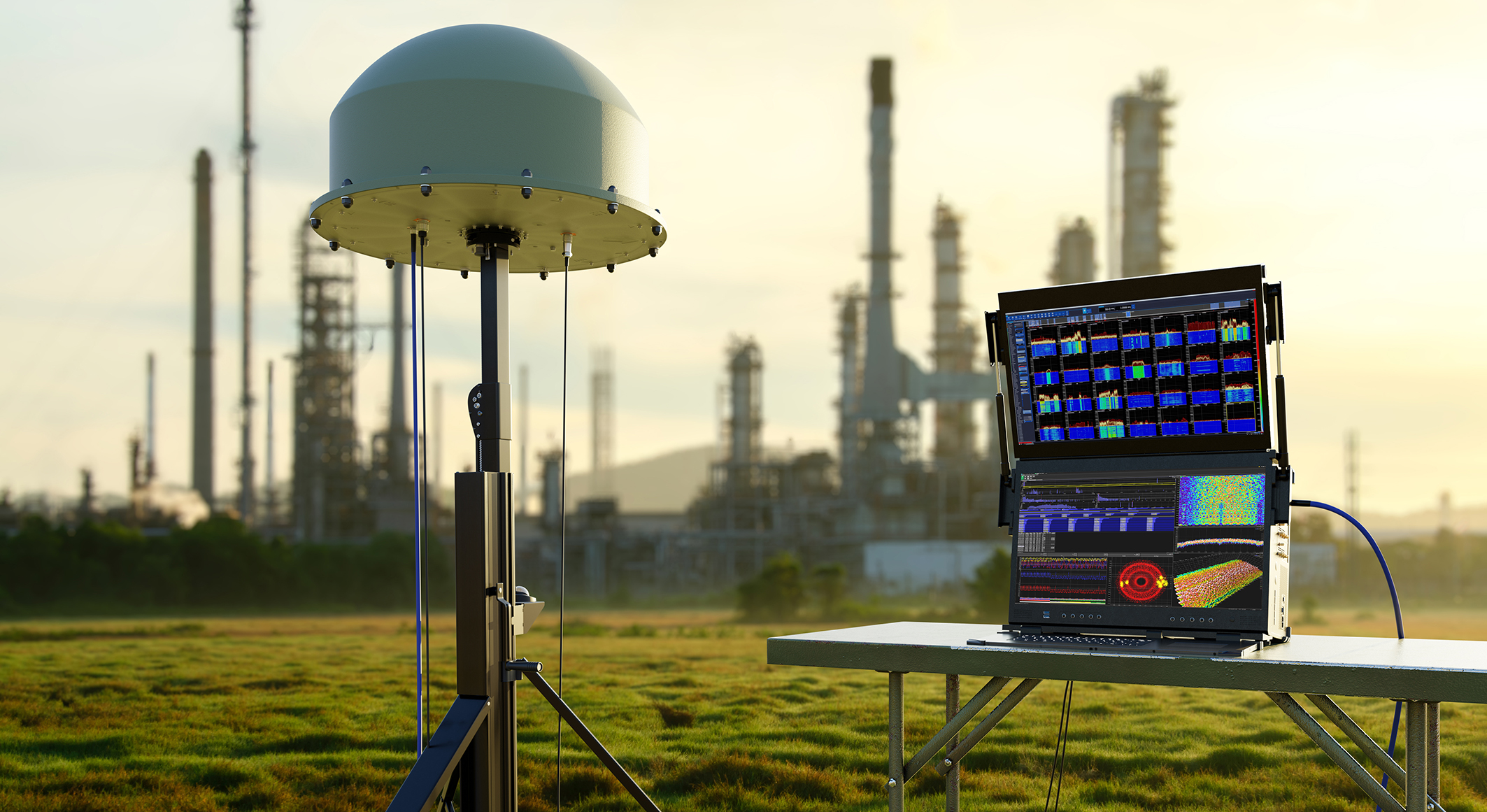 The system comes with 128 GB of RAM and features an 8-terabyte SSD storage drive. This can be expanded to up to 120 terabytes as needed to store raw I/Q data from short signal pulses or long-term SPECTRA data. Thanks to the Smart Buffering solution, in which the oldest data is overwritten with new information, virtually “unlimited” recording time is available. Equipped with two 24-inch 4K monitors, the system is housed in a robust, outdoor-ready case with wheels, making it an easily transportable solution.